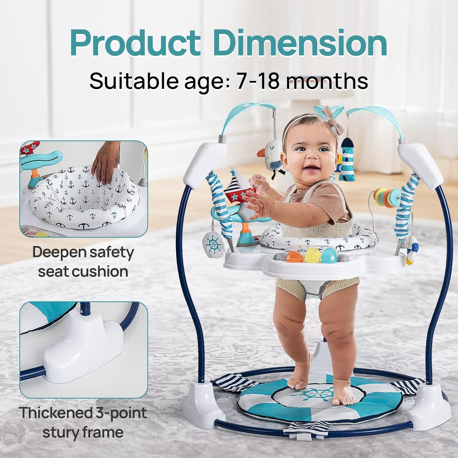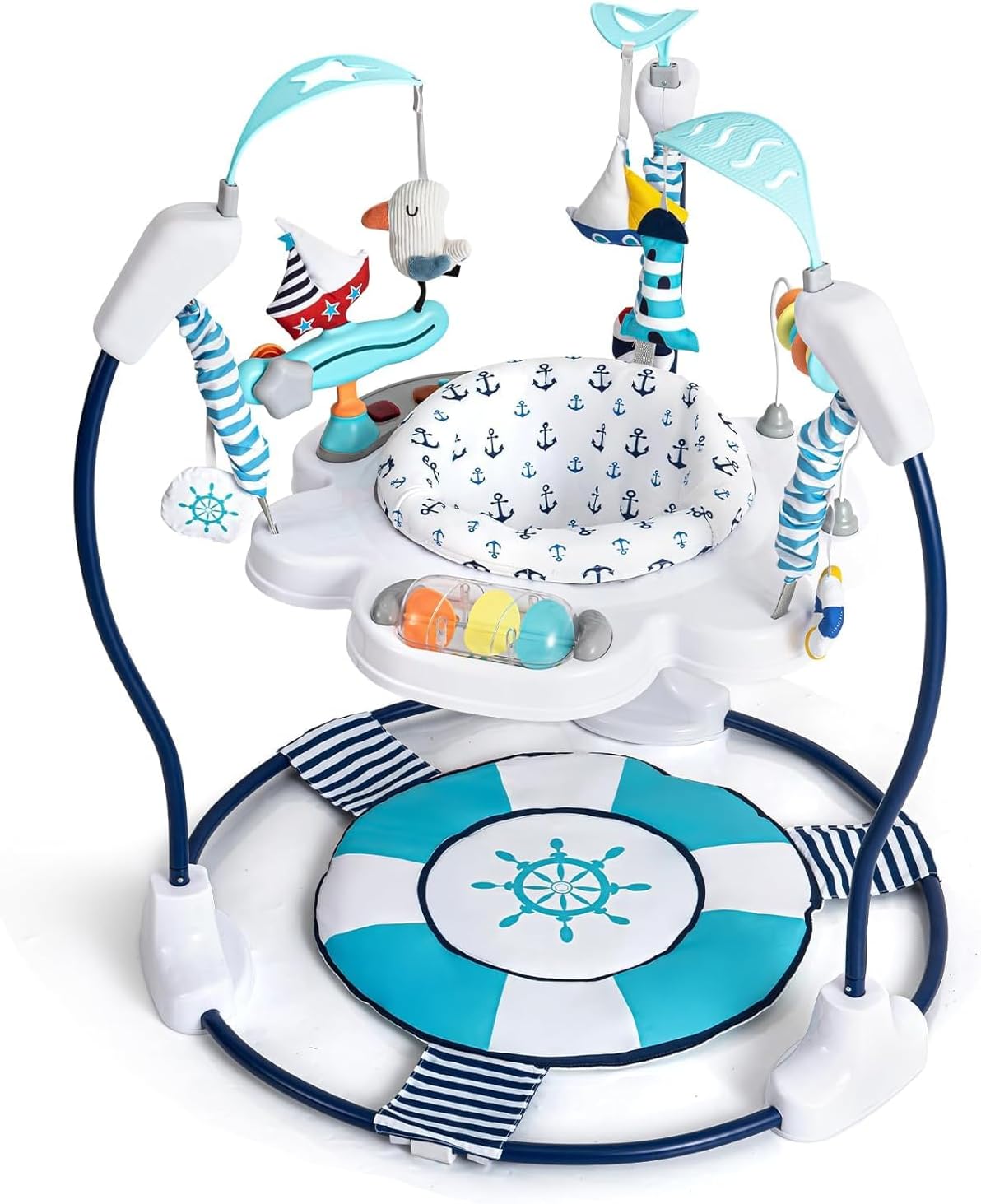 LADIDA Stationary Jumperoo Baby Bouncer Chair Acrobat - 360° Rotating Seat, Musical Toys, and Adjustable Heights (Nautical Activity Blue)