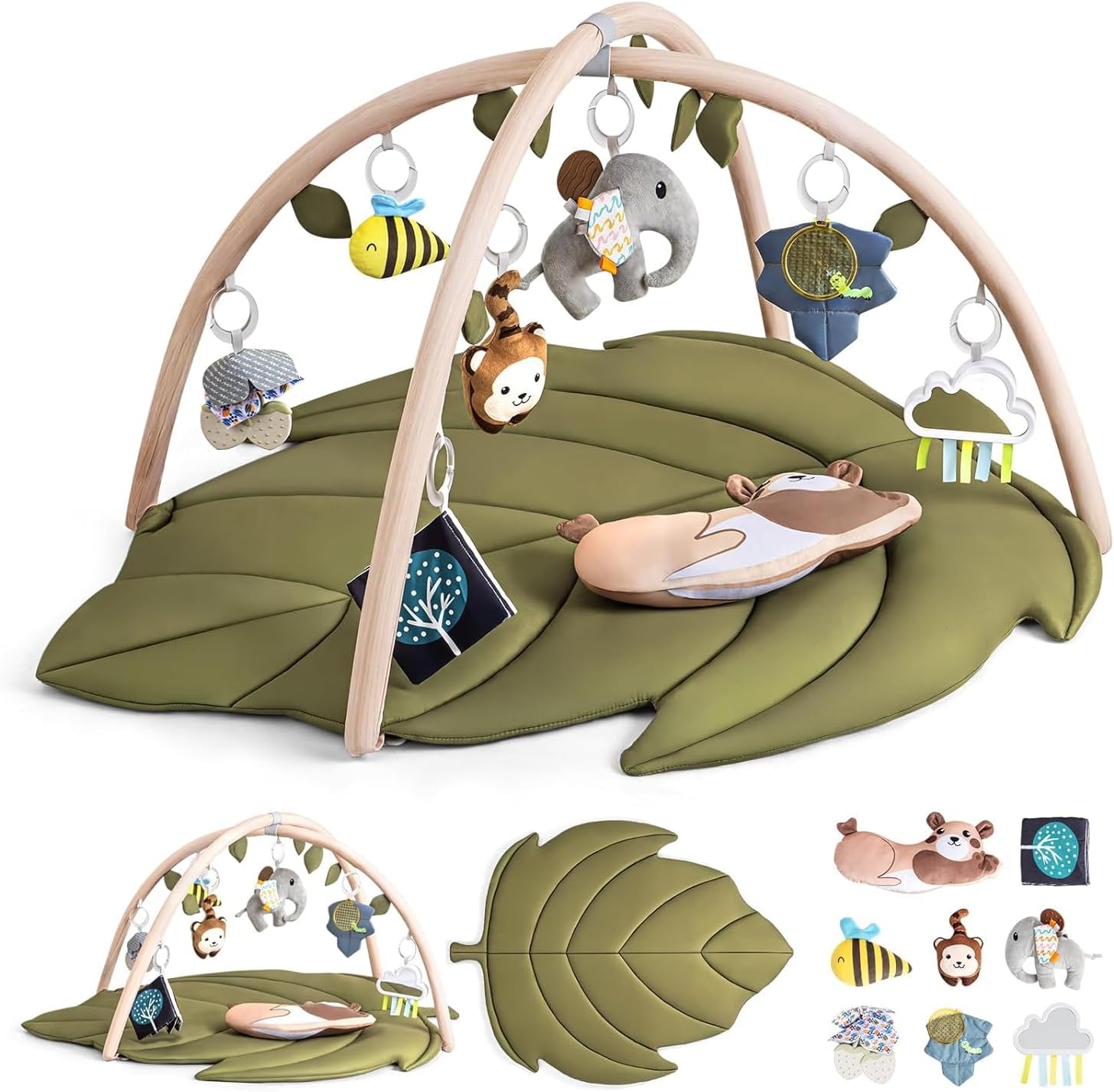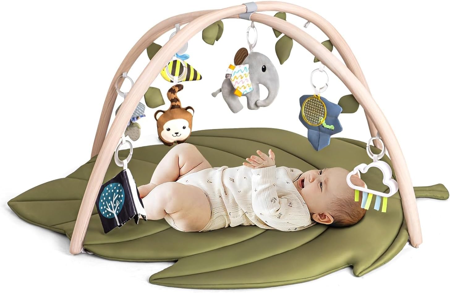 LADIDA Leaf-Shaped Baby Play Gym,This oversized leaf-shaped mat creates a soothing and spacious environment perfect for tummy time, rolling, and crawling, while the activity gym grows alongside your child—from newborn to toddler. Featuring 8 detachable sensory toys, including high-contrast elements, crinkle patches, and a baby-safe mirror, the gym is expertly...